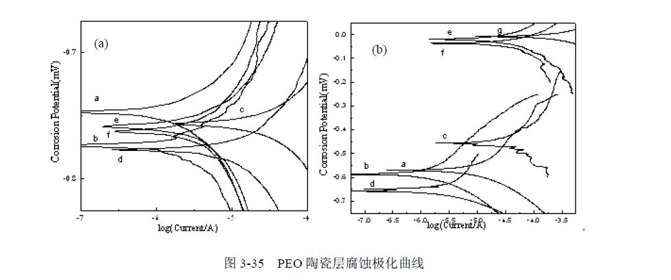 利用三電極體系(三電極構(gòu)成兩個(gè)回路,一是極化回路,二是電位測(cè)量回路)分別測(cè)定了PEO陶瓷層在5%NaCl溶液中的耐蝕性。通過(guò)研究電極的電流和電位,從而得到極化曲線如圖3-35所示。可見(jiàn),兩種腐蝕介質(zhì)中,除了添加Al2O3的陶瓷層外,添加了第二相粒子和無(wú)機(jī)添加劑的PEO陶瓷層的耐蝕性較主體系均有不同程度的提高。