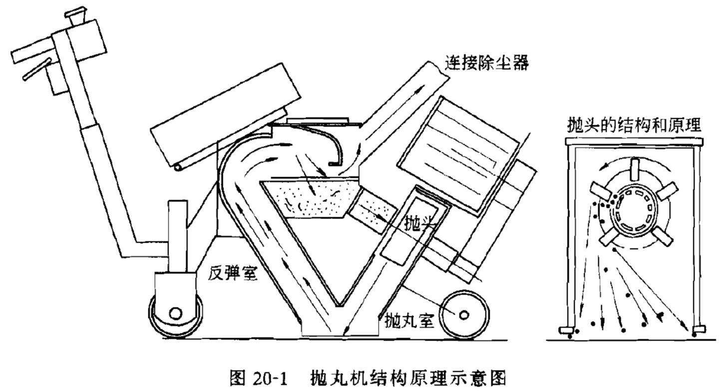 1.拋丸機拋丸機是利用電機驅動的拋丸輪產生的離心力將大量的鋼丸以一定的方向“甩”出,這些鋼丸以巨大的沖擊能量打擊待處理的表面,然后在大功率除塵器的協助下返回到儲料斗循環使用。拋丸機的結構原理見圖20-1。