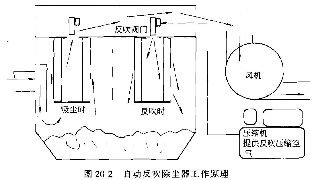塵分離,丸料進入儲料斗繼續循環使用,灰塵則通過連接管進入除塵器。自動反吹除塵器的結構原理見圖20-2。