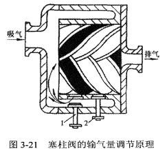 圖3-21表示了塞柱閥調(diào)節(jié)輸氣量的工作原理。塞柱閥的啟閉是通過電磁閥控制液壓泵中油的進(jìn)出來實現(xiàn)的。塞柱閥調(diào)節(jié)輸氣量只能實現(xiàn)有級調(diào)節(jié)。這種調(diào)節(jié)方法在小型、緊湊型螺桿壓縮機(jī)中常??梢钥吹?。