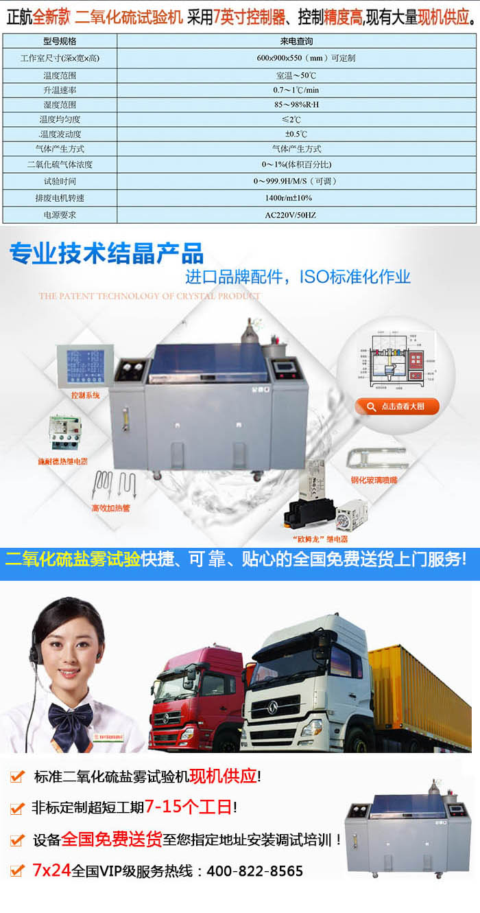 本腐蝕試驗設備嚴格按照DIN50021、DIN50017標準要求制作;參照我國頒布國家軍用鹽霧試驗標準GJB 150.11、GB/T13347-2010;電工電子產品鹽霧試驗的標準GB 2423.17、GB/9789-88《金屬和其他非有機覆蓋層通常凝露下的二氧化硫腐蝕試驗》和德國標準DIN 50018—《飽和環境下的二氧化硫腐蝕試驗》制作;同時滿足用于金屬覆蓋層的鹽霧試驗標準GB 6458、GB 6459、GB6460;專門用于考核輕工產品電鍍層的鹽霧試驗標準GB 5938、GB 5939、GB 5940;主要適用于油漆層的鹽霧試驗標準GB 1771標準及世界上目前正在使用的有關鹽霧腐蝕和二氧化硫、硫化氫氣體腐蝕的其他標準。